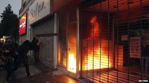 A protest march in Santiago on the 5th anniversary of the murder of a young Mapuche indigena activist...Matias Catrileo...turned violent...as some 200 hooligans attacked 2 banks.